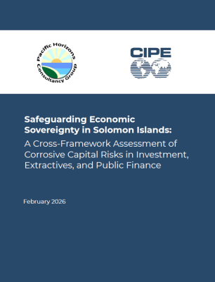 This report examines the governance architecture of Solomon Islands through the lens of economic sovereignty. Commissioned under the Center for International Private Enterprise (CIPE) initiative on safeguarding economic sovereignty in Pacific Island countries, it aligns with CIPE’s corrosive capital framework to assess how lawful capital can distort markets, weaken institutions, and undermine long-term national wealth when governance systems are misaligned.