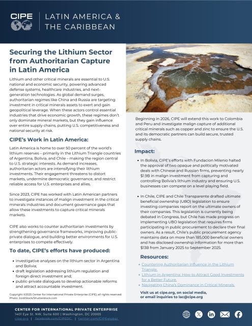 Since 2023, CIPE has worked with Latin American partners to investigate instances of malign investment in the critical minerals industry and to document the governance gaps that allow these investments to capture critical mineral markets.CIPE also works to counter authoritarian investments by strengthening governance frameworks, improving public–private dialogue, and creating better environments for U.S. enterprises to compete effectively.